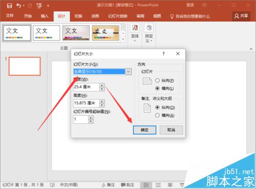 3、点击“自定义幻灯片大小”命令选项后,这个时候会打开“幻灯片”大小对话框。在“幻灯片大小”对话框中,选择“幻灯片大小”为“全屏显示(16:10)”,而后再点击“确定”按钮。如图所示;
