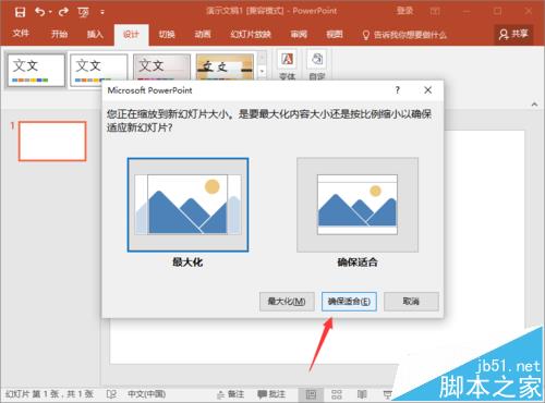 4、在弹出的“您正在缩放到新幻灯片大小······”对话框中,选择“确保合适”选项并点击它。如图所示;