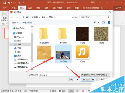 5、接着,打开“插入”菜单选项卡,并点击“图像”功能区的“图片”按钮选项。在弹出的“插入”图片对话框中,选择下载好的图片模板,再点击“插入”按钮,将图片插入的幻灯片中。如图所示;