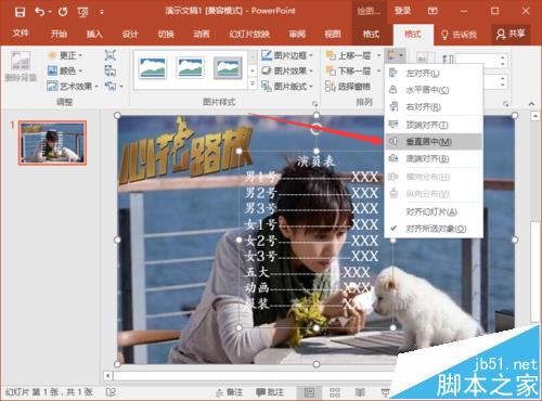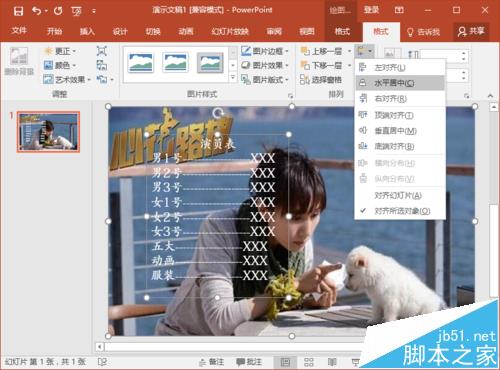 8、文字内容设置好以后,按住键盘的Ctrl键,同时选择图片和文本框,设置图片和文本的上下左右居中对齐。如图所示;
