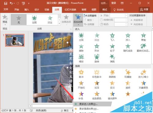10、在弹出的动画菜单选项框中,找到“更多进入效果”命令选项并点击它。点击“更多进入效果”命令选项后,这个时候会打开“添加进入效果”对话框。在“添加进入效果”对话框中,拖动滚动条向下,找到“字幕式”选项,再点击“确定”按钮。如图所示;