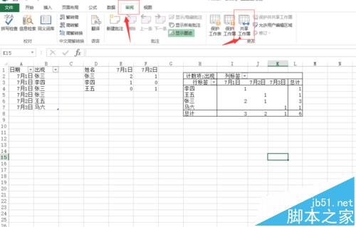 4、再选择工具栏上面“审阅”中的“共享工作薄”