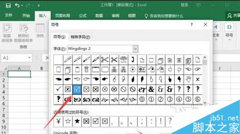 6、在“Wingdings 2”字体样式下,找到打勾方框选项并选择它,然后点击“插入”按钮。如图所示;