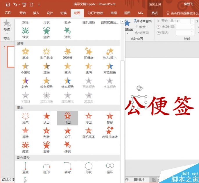 现在点选一个笔画,比如“公”字上面的一捺,然后切换“动画”选项卡,点击展开“动画”下拉框,从中选择“动作路径”中的“自定义路径”,然后用鼠标画出该笔画由中心向四周飞出的路线(双击鼠标结事绘制)。同样方法,将所有拆解的笔画都如此设置一翻,为了达到爆炸的效果,路径最好是由中心向四周飞出。(或者直接使用“飞出”效果)