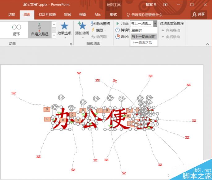 此时按F5键预览动画效果,会发现必须点击(或按空格键)一次才会飞出一个笔画,这跟爆炸效果有点不符。很好解决,首先按Ctrl+A键全选所有笔画,然后在上面工具栏中,将“开始”设置为“与上一动画同时”,此时再按F5键播放,就会是本文开始动图中的效果了。