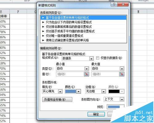 3、点击“数据条”或者直接把鼠标放在数据条选项上,就会出现各种可供选择的数据条模板,有渐变填充效果和实心填充效果,鼠标放在相应的图标上就可显示出效果,确定后直接点击图标即可。当然如果没有想要的模板,可以点击“其他规则”,弹出“新建格式规则”设置卡,进行对应设置即可。