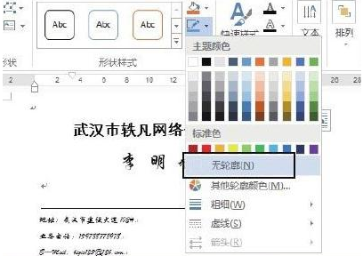 Word2013制作名片步骤4:在“绘图工具—格式”选项卡的“形状样式”组中单击“形状轮廓”按钮上的下三角按钮,在打开的下拉列表中选择“无轮廓”选项取消文本框的边框,如图4所示。