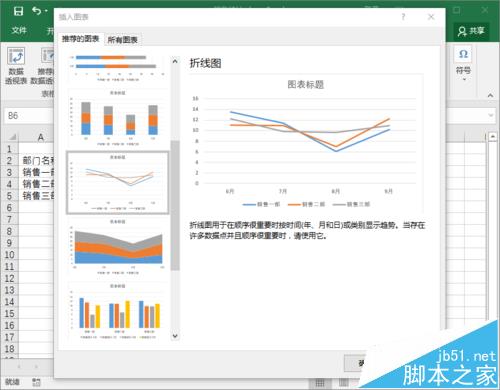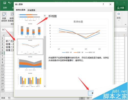 5、在“插入图表”对话框中,选中推荐的图表下的“折线图”选项,再点击“确定”按钮。如图所示;