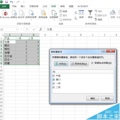 5、这是桌面会弹出“删除重复项”对话框,然后在对话框中勾选需要删除重复项的列名称。