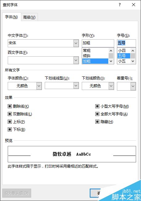 第2步:先将光标置入“查找内容”文本框中,然后点击下方的“格式”,从弹出列表中点击“字体”。在打开的查找字体窗口,选择需要查找的字体,比如本例要查找的是中文字体宋体,字形为加粗,字号是五号。设置好后点击“确定”返回。
