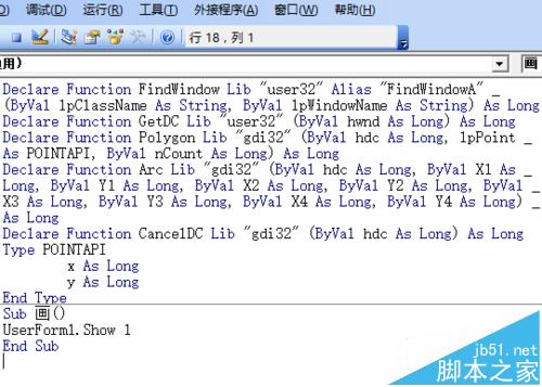 3、模块编程。在模块1内编程,声明5个函数、1个结构,并编写一句显示窗体的程序——“画”。