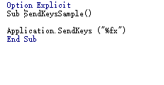 3、这个代码很简单,sendkeys是应用程序中的一个方法,作用是依次顺序发送几个按键值。对应的键值可以看出%号是alt键,fx则是键盘上对应的fx键。我们可以在excel中手动运行一下按下这三个键的作用。