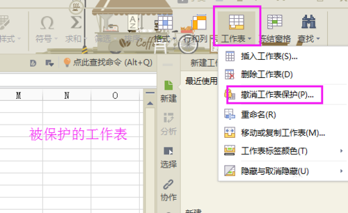 5、选中的工作表进行保护之后,在去看“工作表”的选项,你会发现显示的是“取消工作表保护”而默认显示是“工作表保护”,这就证明本工作表是被保护的。
