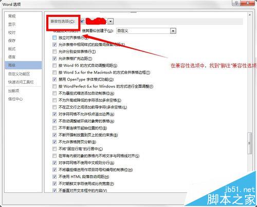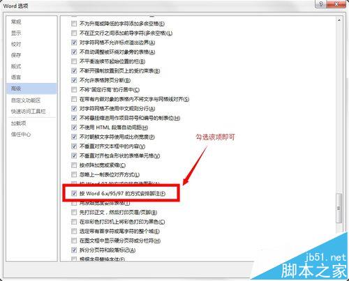4、在选中“高级”选项后,在右侧找到“兼容性选项”。在其子内容中找到“按word 6.x/95/97的方式安排脚注”,勾选该内容。
