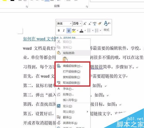 5、设置好后,下次可以直接选择超链接文字,右键单击,选择打开或者取消超链接,如图