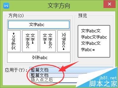 注意:文字方向在设置时,默认是整篇文档都会改变方法。不过在“文字方向”的对话框里(如下图所示),可以设置文字方向是“整篇文档”还是“所选文字”。