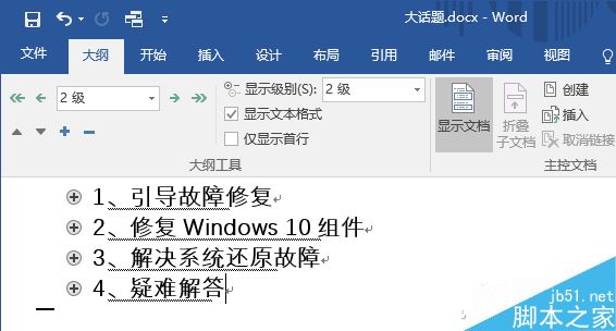 这里以Word 2016为例,打开Word文档后,切换到“视图”选项卡,再点击切换到“大纲视图”,在“显示级别”中,根据实际情况选项相应级别,比如小编所用文档中的主要段落是以二级标题划分的,所以这里选择“2级”,这样一来,一些细节内容就被折叠起来了。