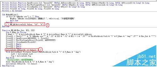 6、将工具中VBA文本文档的代码复制,粘贴到当前窗口。图中第一处标记:i = MK_QR(ActiveCell.Value,"10", "4"),括号内有三个参数:ActiveCell.Value即是要转换成二维码的内容,本例时当前选中单元格内容。"10",二维码的显示精度,显示精度越高辨识度越高,但读取时间较长。"4",二维码尺寸图中第二处标记:ActiveCell.Offset(0, 1).Select,将生成的二维码放置的位置,样本代码中