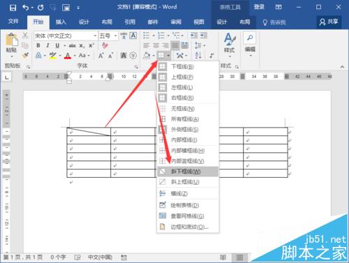3、表格绘制完成后,选中需要绘制斜线表头的单元格,然后再点击设计选项卡下的边框按钮,在弹出的下来菜单中选择斜下框线。如图所示;