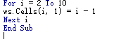 6、接着使用for循环语句来简写了序列号,这里是个小技巧,大家可以在不断的练习中学会这样使用循环来优化代码的方法。简单的说,就是顺序选择了a列2-10行的单元格并将其赋值为1-10。