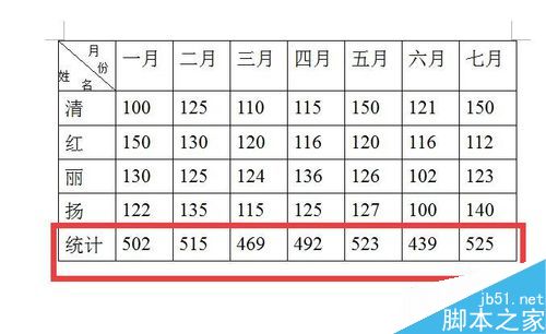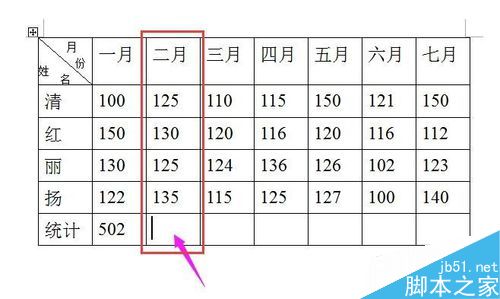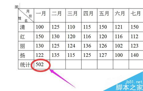 “502”是表格”一月“这一栏100+150+130+122的总数。