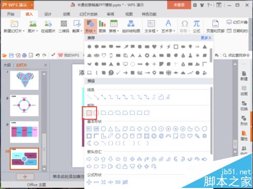 3、在插入菜单选项卡下,依次点击“形状”-->“矩形”选项按钮。如图所示;