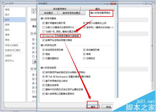 4、在自动更正选项栏目下,点击“键入时自动套用格式”,然后将internet及网络路径替换为超链接前面的勾打上,然后点击“确认”,