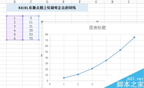 1、我们主要是来进行离散型图标的一个切线处理。首先是在表格里填充数据,如下图的例子。其中公式数据为y=2x^2+1