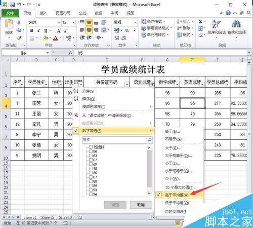 6、如果牵扯到平均数问题,也可以通过同样的方法点击“数字筛选>大于平均数”选项,如图所示。
