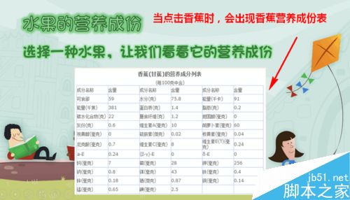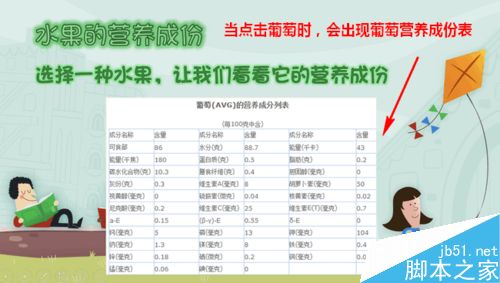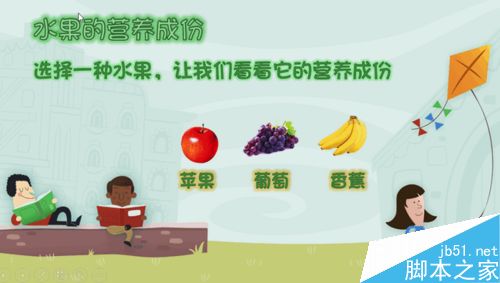 6、现在,一切就大功告成了。当我们放映幻灯片时,点击苹果就会飞入苹果的营养成分表了。