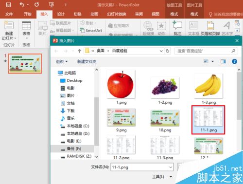 2、然后,点击菜单“插入”-“图片”,将苹果营养成份表图片插到PPT中来。