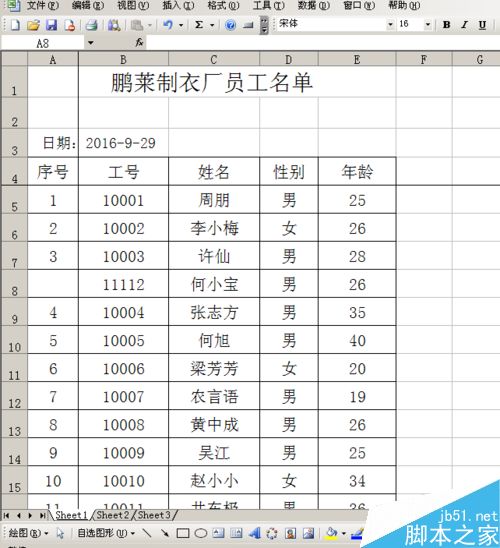 3、输入员工相关信息后,发现第9行的序号还是4,后面行的序号也没有变化。