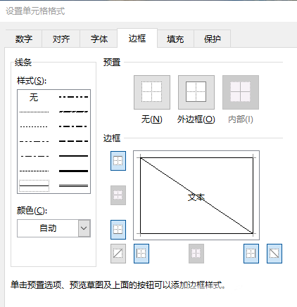 上面图中的表格,稍有难度的就是表头中的斜线,实际上它非常简单。选中该单元格后,进入单元格的边框设置中,可以看到中间示意图下方,左右各有一个对角线的示意图标,想要哪种对角斜线,直接点选就可以了。