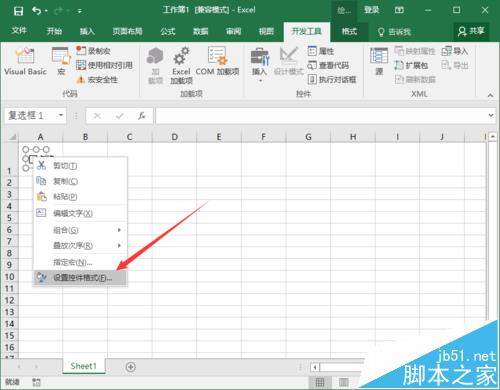 5、复选框画好以后,将其选中,并点击鼠标右键,在弹出的选项框中,点击“设置控件格式”选项。如图所示;
