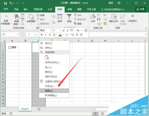 14、返回到工作表中,选中C列单元格,点击鼠标右键,在弹出选项框中点击“隐藏”选项。如图所示;