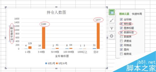 7、比如勾选上轴标题和数据标签,我们就会看到坐标轴X/Y都出现了一个标题,可以更改,数据也会呈现在柱形的顶端。