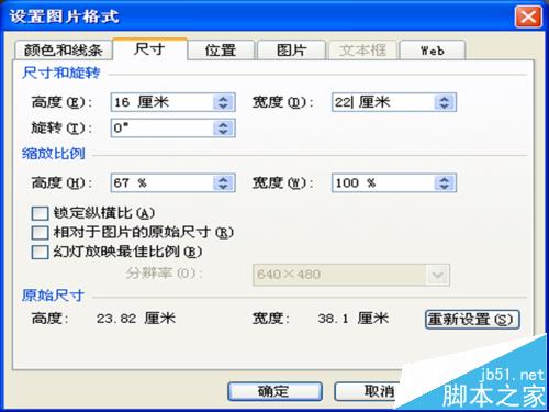 3、双击该图片调出设置图片格式对话框,切换到尺寸选项设置高度为16cm宽度为22cm。