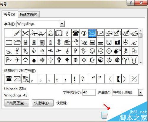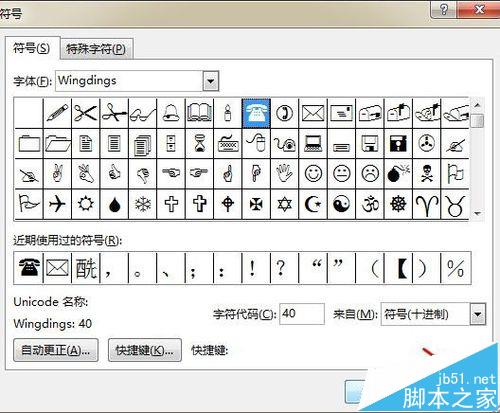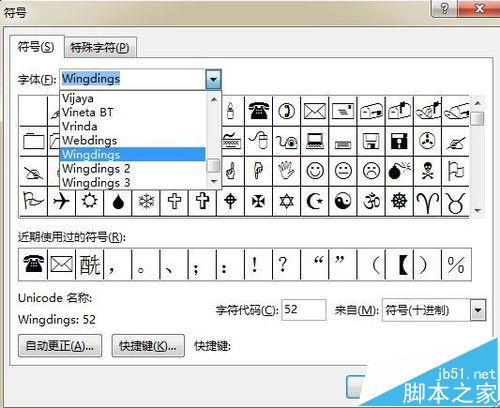 3、此时弹出“符号”对话框,在“字体”下拉列表框中选择相应的符号类型如Wingdings。