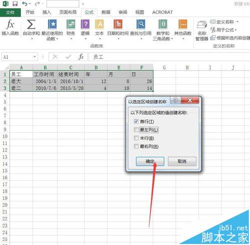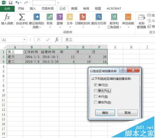 4、这时会弹出“已选定区域创建名称”对话框,这里我们勾选“首行”复选框。