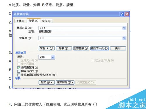 2、执行 编辑-替换命令,在查找和替换对话框中,输入查找内容为(*),并勾选使用通配符。