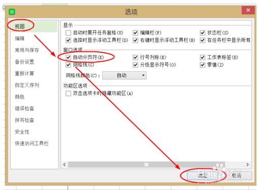 3、在【选项】界面下,点击选择【视图】--勾选【自动分页符】--【确定】选项完成设置。(如图所示)