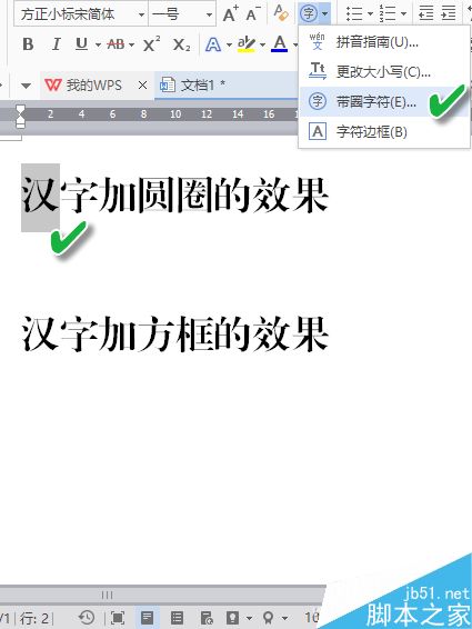 如果要给文字添加边框效果,虽然用上述“方框”类型可实现单个汉字的边框显示。但如果要给一行文字添加整体边框,需要通过“带圈字体”字体菜单中的“字符边框”命令来实现。