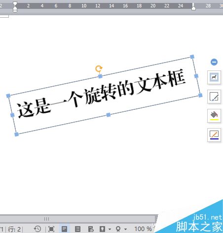 通过WPS“插入→文本框”命令插入一个文本框(Word 2016的操作为“插入→文本→文本框”),之后选中文本框后发现其边框中央部分有一个半圆形的箭头按钮,通过按下该按钮并拖动鼠标,即可实现文本框的任意旋转。如果希望倾斜的文字在版面中以无边框的状态出现,可点击右侧设置工具条最下方的线条按钮,将线条设置为“无”即可。