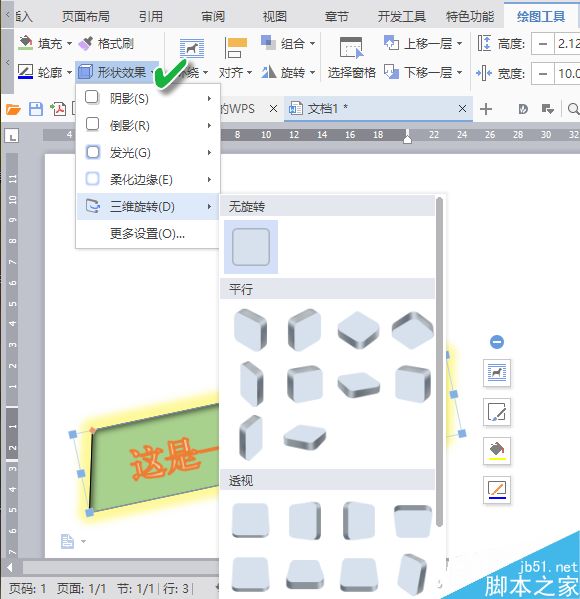 同样我们也可以对自定义后的形状作进一步的效果设置,包括填充、轮廓和各种预设的形状效果等。甚至可以创造出具有三维效果的文本框。这只需通过“形状样式”选择框下选择相应的效果即可。