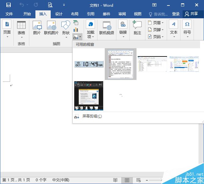 在“插入→插图”工具组中就能找到“屏幕截图”工具,单击它,“可用视窗”中就列出当前正在运行的程序截图窗口,点击其中之一,就能将选中的截图插入到文档中光标所在位置。