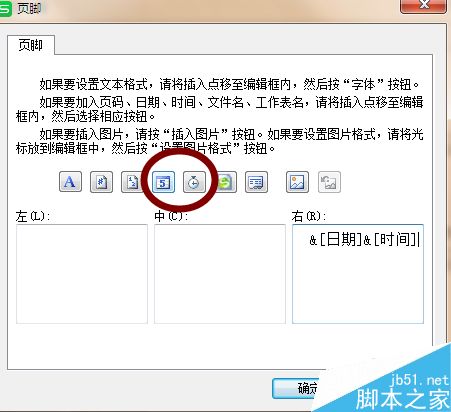 4、然后选择左右中,然后点击日期和时间的图标,设置好之后点击确定,如图