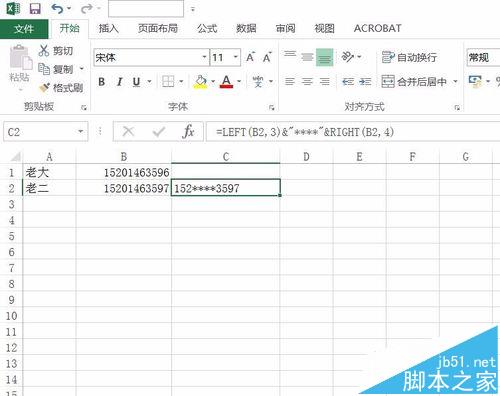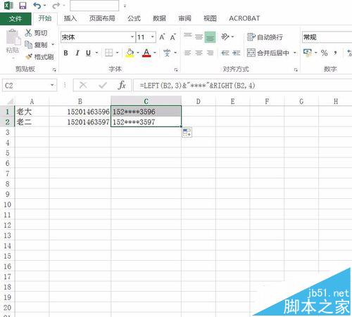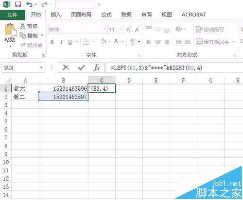 3、然后输入公式:=LEFT(B2,3)&"****"&RIGHT(B2,4)