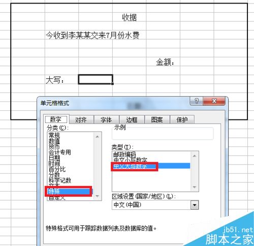 3、在单元格式里找到数字--选择分类里的“特殊”,在类型中选择“中文大写数字”然后确定就可以了.如图