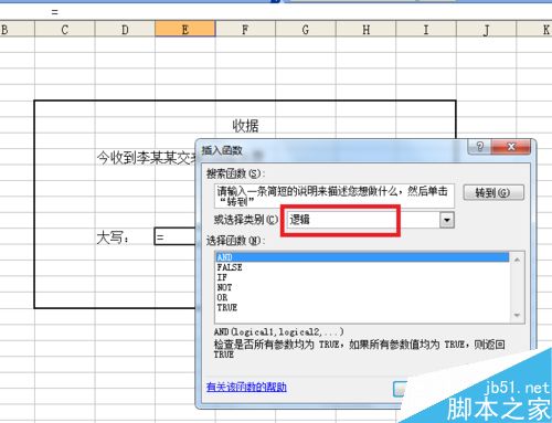 4、用函数设定单元格式,点击中文大写数字显示的位置,然后点击插入函数,选择罗辑,这里要注意的是,小写单元格与大写单元格的数值的是一样。如图