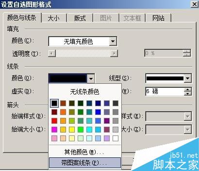 6、在“线条颜色”右侧三角形点下,弹出的菜单中点“带图案线条”;
